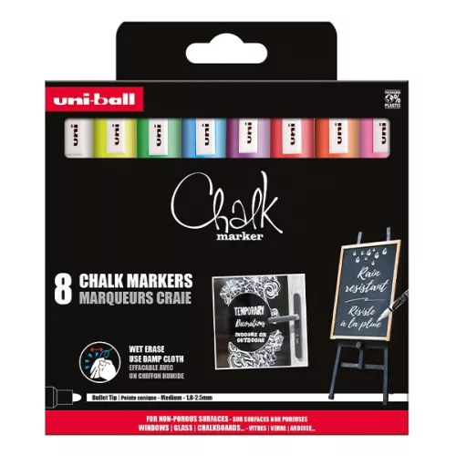 Az Uni Folyékony krétával nem porózus felületekre, például üvegre, fára, krétatáblákra és krétával festett falakra írhatunk és könnyen eltávolítható.