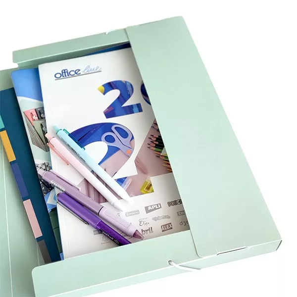 Erős, könnyű füzetbox, mely nagyszámú A4-s dokumentum tárolására és hordására alkalmas. Belső fülei és a mappa színével megegyező színű, kerek, erős gumiszalag megakadályozzák az iratok kiesését. A kiváló minőségű és tartós kivitelezés megvédi a tartalmat a szennyeződéstől vagy a sérüléstől. Formátuma: A/4. Anyaga: 100% újrahasznosított PP, 230 qm. Méretei: 25 x 34,8 cm, gerincvastagság 3 cm. SoftTouch felület. Global Recycled Standard tanúsítvány