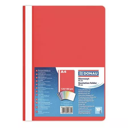 - A4 méretű dokumentumok tárolására - 200 lap lefűzésére alkalmas - 110 µ polipropilén áttetsző, narancsos fedlap és 180 µ polipropilén hátlap - feliratozható oldalcsík - 12 színváltozat