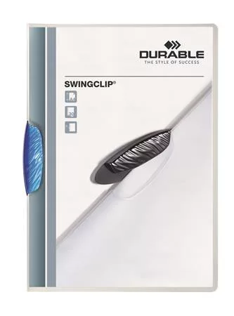A SWINGCLIP egy vonzó, fiatalos klipmappa, minden típusú prezentációhoz, irathoz, rugalmas polipropilénből. -egyszerű és gyors dokumentumkezelés az oldalra kihajtható műanyag klipnek köszönhetően -színes vagy áttetsző kapoccsal -A4 formátumú dokumentumokhoz, pl. ajánlatokhoz, megbeszélési és oktatási dokumentumokhoz -lyukasztás nélküli dokumentumkezelés -lefűző szerkezet: elliptikus, kihajtható műanyag klip -lefűző szerkezet színe: kék -előlap színe: áttetsző -hátlap színe: áttetsző -a dokumentum védett a naptól -külső méretek: 218 x 306 x 8 mm (szé x ma x ho) -kapacitás: 30 lap -formátum: A4 -irány: álló -anyaga: műanyag Itt megtekinthető és letölthető a termékadatlap. Itt megtekinthető és letölthető a környezetvédelmi adatlap. Gyártó/első EU forgalmazó elérhetősége:  DURABLE Hunke & Jochheim GmbH & Co. KG Westfalenstrasse 77-79, D- 58636 Iserlohn, Germany info@durable.de www.durable.de