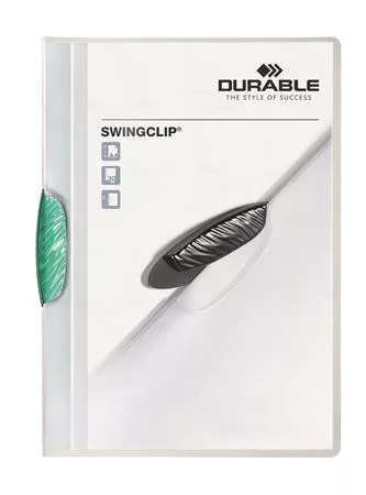 A SWINGCLIP egy vonzó, fiatalos klipmappa, minden típusú prezentációhoz, irathoz, rugalmas polipropilénből. -egyszerű és gyors dokumentumkezelés az oldalra kihajtható műanyag klipnek köszönhetően -színes vagy áttetsző kapoccsal -A4 formátumú dokumentumokhoz, pl. ajánlatokhoz, megbeszélési és oktatási dokumentumokhoz -lyukasztás nélküli dokumentumkezelés -lefűző szerkezet: elliptikus, kihajtható műanyag klip -lefűző szerkezet színe: sötétzöld -előlap színe: áttetsző -hátlap színe: áttetsző -a dokumentum védett a naptól -külső méretek: 218 x 306 x 8 mm (szé x ma x ho) -kapacitás: 30 lap -formátum: A4 -irány: álló -anyaga: műanyag Itt megtekinthető és letölthető a termékadatlap. Itt megtekinthető és letölthető a környezetvédelmi adatlap. Gyártó/első EU forgalmazó elérhetősége:  DURABLE Hunke & Jochheim GmbH & Co. KG Westfalenstrasse 77-79, D- 58636 Iserlohn, Germany info@durable.de www.durable.de