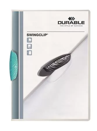 A SWINGCLIP egy vonzó, fiatalos klipmappa, minden típusú prezentációhoz, irathoz, rugalmas polipropilénből. -egyszerű és gyors dokumentumkezelés az oldalra kihajtható műanyag klipnek köszönhetően -színes vagy áttetsző kapoccsal -A4 formátumú dokumentumokhoz, pl. ajánlatokhoz, megbeszélési és oktatási dokumentumokhoz -lyukasztás nélküli dokumentumkezelés -lefűző szerkezet: elliptikus, kihajtható műanyag klip -lefűző szerkezet színe: világoskék -előlap színe: áttetsző -hátlap színe: áttetsző -a dokumentum védett a naptól -külső méretek: 218 x 306 x 8 mm (szé x ma x ho) -kapacitás: 30 lap -formátum: A4 -irány: álló -anyaga: műanyag Itt megtekinthető és letölthető a termékadatlap. Itt megtekinthető és letölthető a környezetvédelmi adatlap. Gyártó/első EU forgalmazó elérhetősége:  DURABLE Hunke & Jochheim GmbH & Co. KG Westfalenstrasse 77-79, D- 58636 Iserlohn, Germany info@durable.de www.durable.de