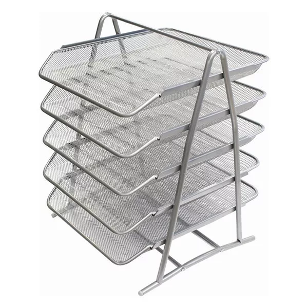 Fémhálós kivitelű ötszintes irattartó tálca, A/4 -es méretű iratok tárolására, ezüst színben
