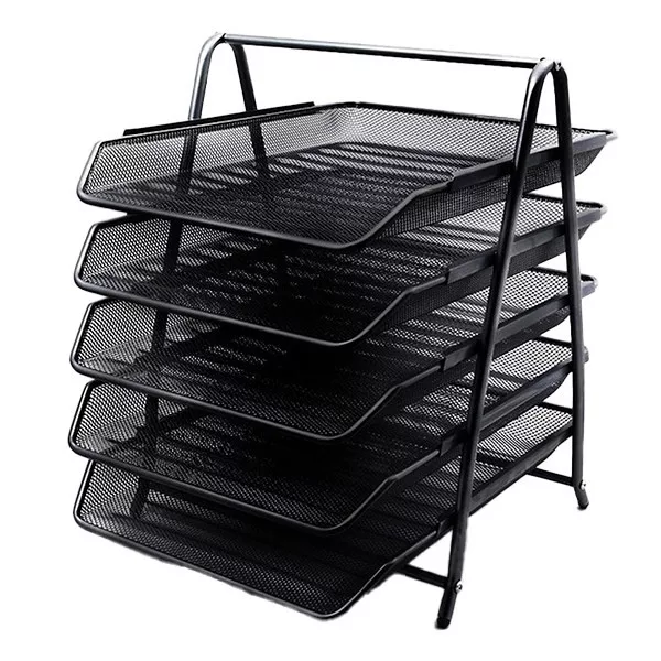 Fémhálós kivitelű ötszintes irattartó tálca, A/4 -es méretű iratok tárolására, fekete színben