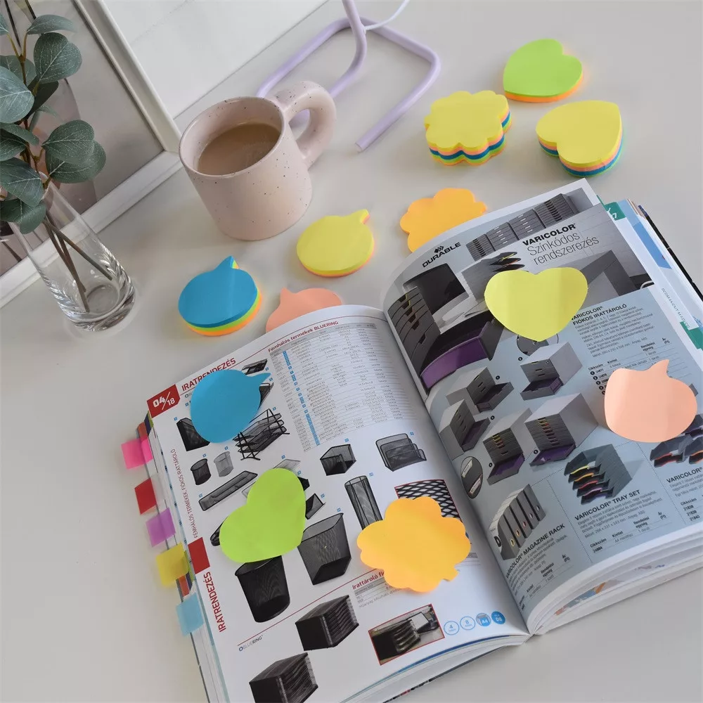 Ideális rövid üzenetekhez, jegyzetekhez. Szinte minden felületen tapad és könnyen visszaszedhető. Feltűnő élénk színű,és formájú, hogy ne vesszen el az információ. Katalóguskód: 24195