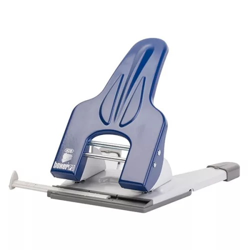 Irodai, karos, nagyteljesítményű, színes fémvázas lyukasztó, távtartóval, papírhulladék tartóval ellátva, 45 lap lyukasztási kapacitással.